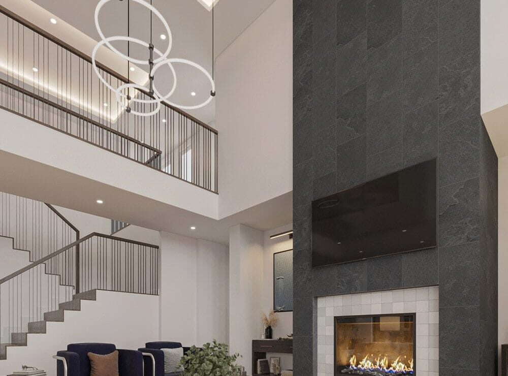 Welcome to one of our most recent design projects: a simply modern two-story home with an organized one-car garage. In this modern house that flawlessly integrates form and function, simplicity meets comfort. The design palette is a masterful blend of materials, with a beautiful interplay of brick, wood, and other textures that contribute to the interesting modern look. Step outside into the backyard to find an outdoor oasis intended for relaxation and pleasure. An elegant lounge area with a bonfire pit welcomes pleasant meetings under the stars. A stylish dining room nearby calls for outdoor meals with loved ones. We’ve carefully blended multiple ground levels and an abundance of greenery to create the illusion of greater space, resulting in a visually expansive and inviting backyard. This project demonstrates our dedication to contemporary design that combines simplicity and comfort, providing a harmonious living experience that is truly worth investigating. So come see it for yourself and experience modern living at its finest!